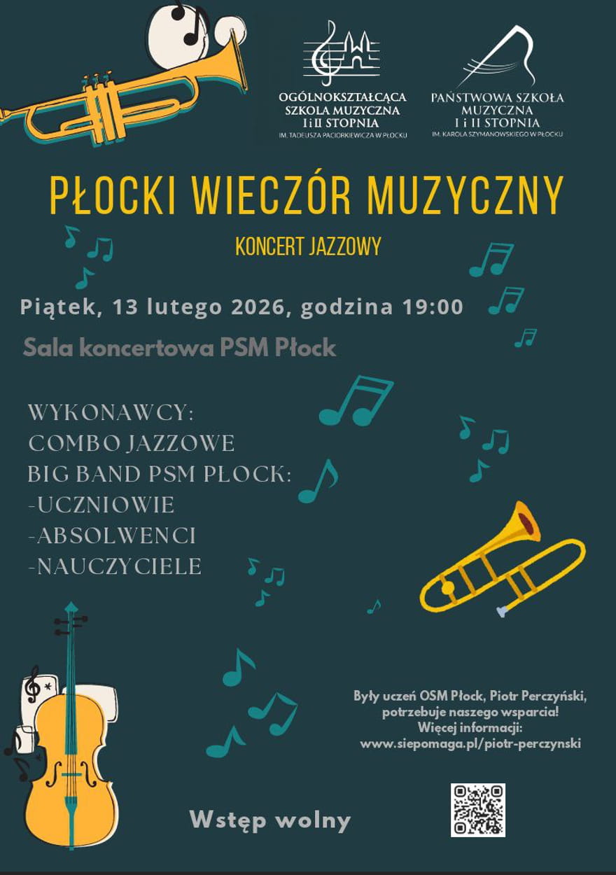 Muzycy zachęcają, by podczas koncertu wesprzeć Piotra Perczyńskiego. To młody puzonista, który swoją muzyczną drogę rozpoczynał w OSM I st. w Płocku. 19-latek przeżył 13 października 2025 roku dramatyczny wypadek i potrzebuje pomocy.