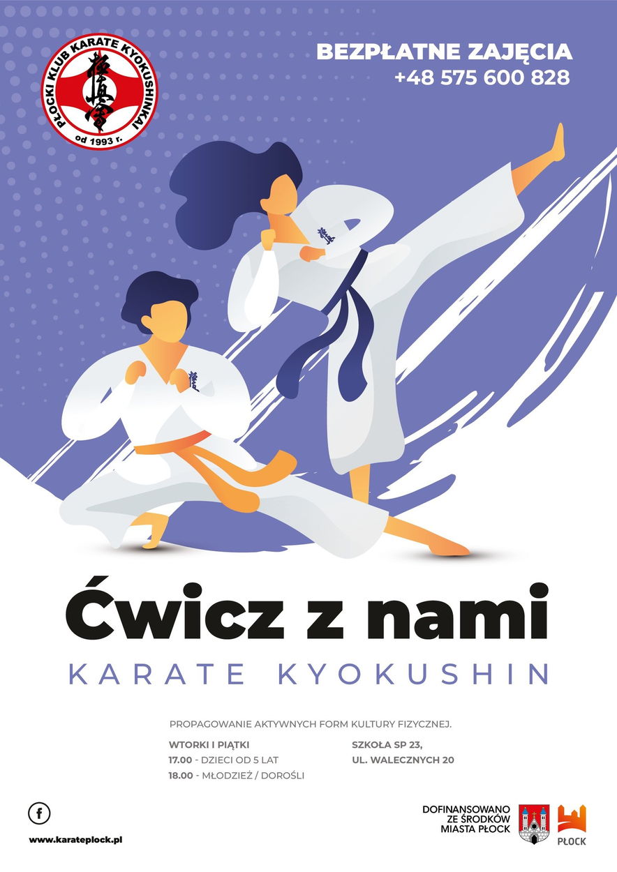 Od września Płocki Klub Karate Kyokushinkai organizuje bezpłatne zajęcia „Ćwicz z nami karate”. Projekt skierowany jest do mieszkańców Płocka, którzy nie są jeszcze zrzeszeni w klubie, zarówno dzieci, młodzieży, jak i dorosłych.