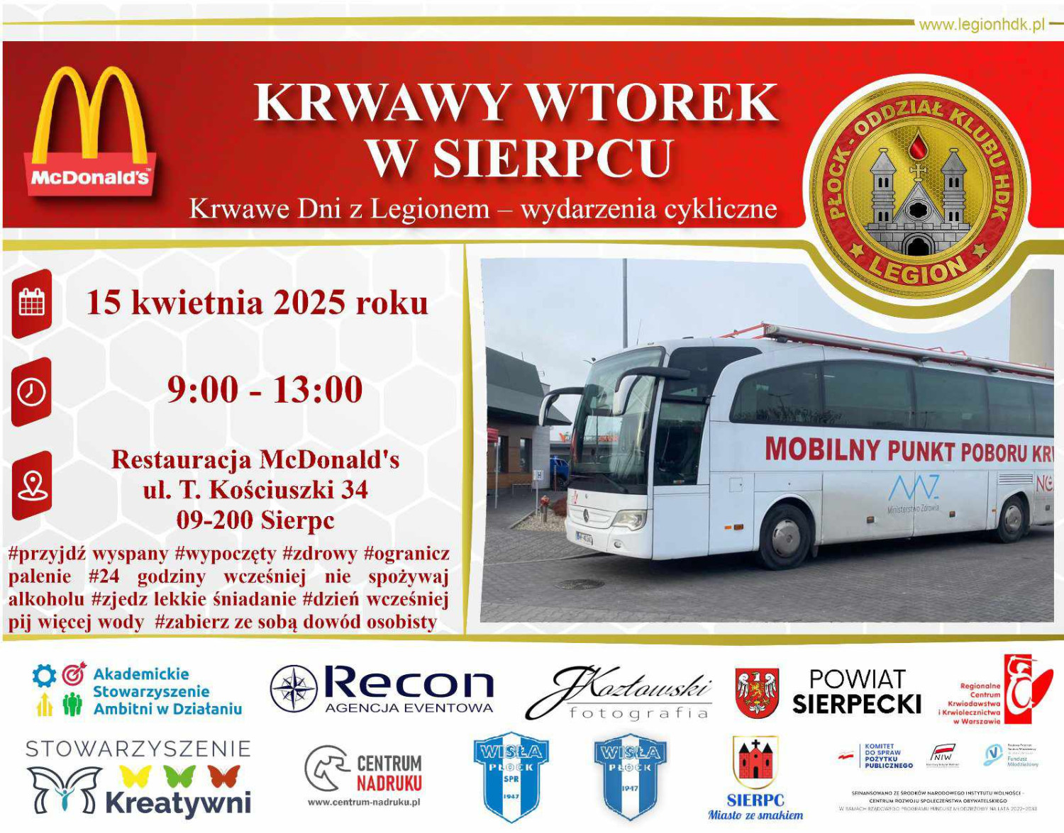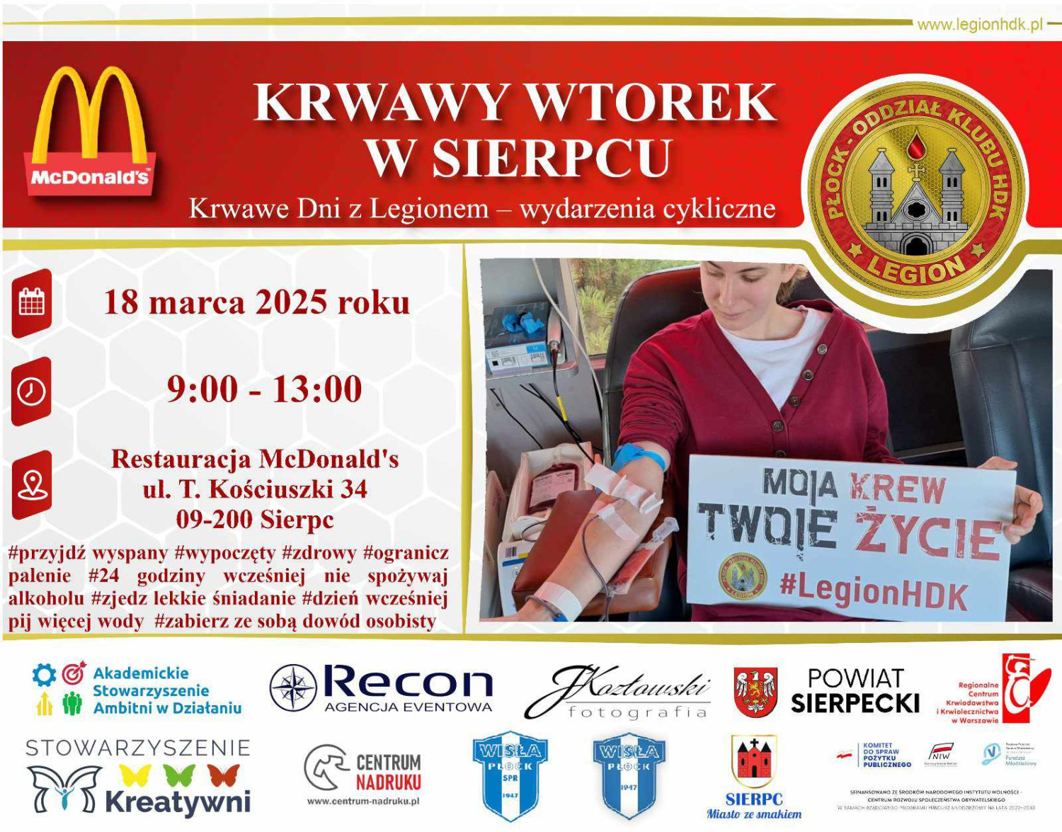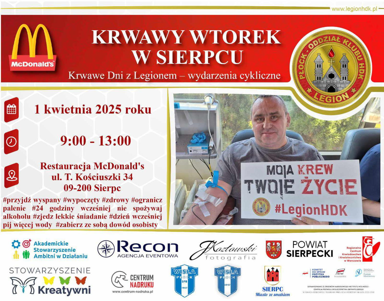 - „Krwawy Wtorek w Sierpcu” 18.03, 01.04, 15.04, godz. 9.00 – 13.00, Krwiobus przy restauracji McDonald’s, ul. Tadeusza Kościuszki 34