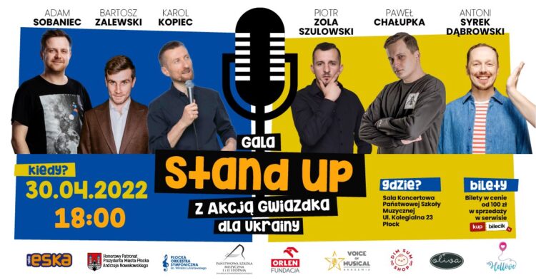Na ostatni dzień kwietnia, 30 kwietnia o godz. 18 zaplanowano Galę Stand-up z Akcją Gwiazdka dla Ukrainy, która odbędzie się w Sali Koncertowej Państwowej Szkoły Muzycznej w Płocku. To charytatywne wydarzenie organizowane jest dzięki Monice Sikorskiej, inicjatorce akcji, która na co dzień pracuje w PKN ORLEN, w Dziale Planowania i Zakupu Prac oraz Projektów Badawczych. Partnerem akcji jest Fundacja ORLEN.