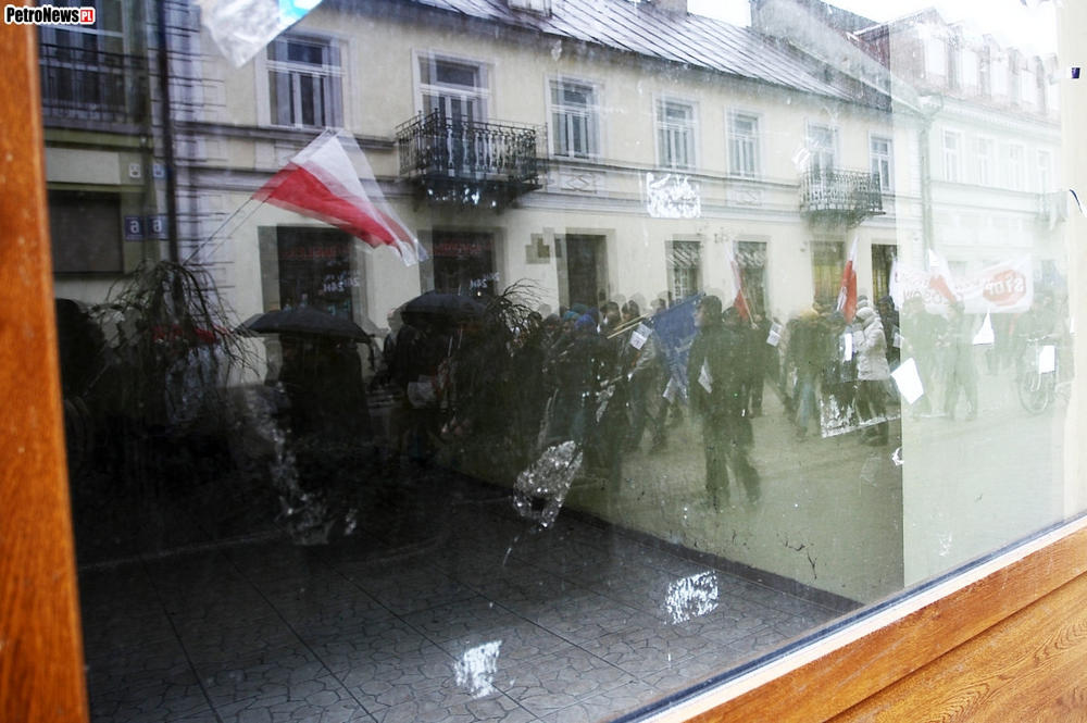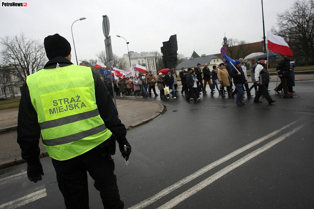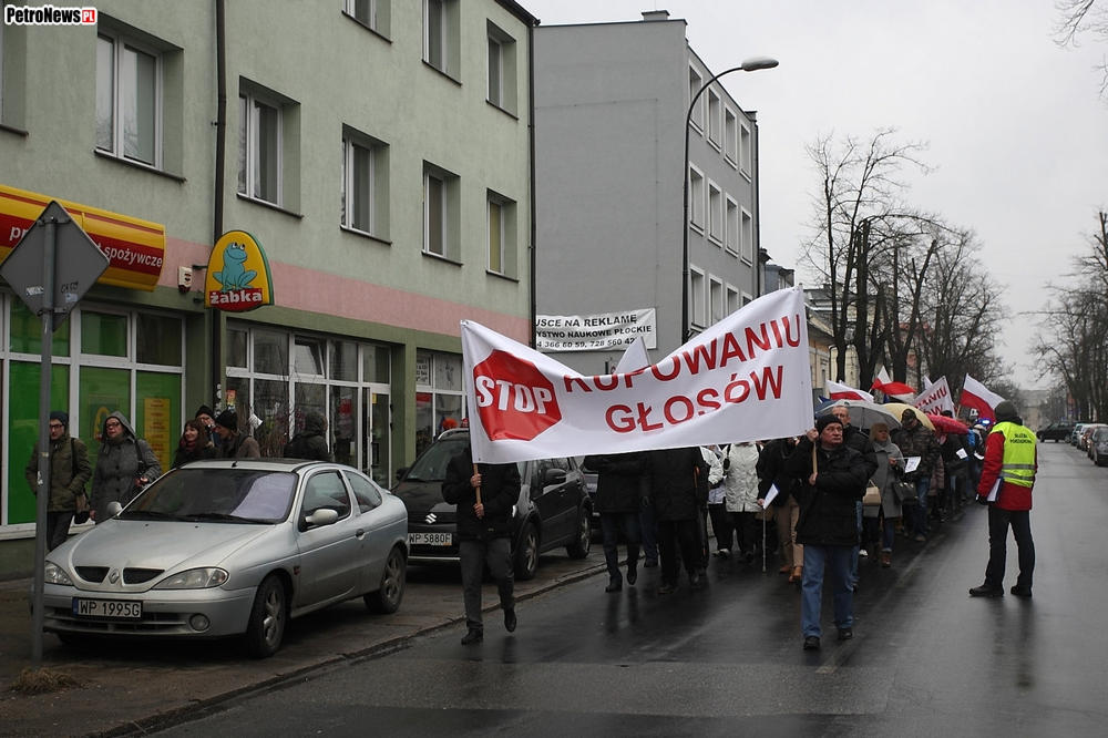 Po przemówieniach, uczestnicy demonstracji uformowali kolumnę, która ruszyła w stronę ratusza. Część uczestników niosła transparenty, w kilku dłoniach powiewały niebieskie chorągiewki z logo partii. Podczas marszu wznoszono okrzyki: „Żądamy uczciwych wyborów”, „Całe zło to PO” czy „Stop kupowaniu głosów”. Zgromadzeni płocczanie szli dość szybko, bo pogoda raczej nie sprzyjała uczestnikom protestu. W drodze przed ratusz organizatorzy przewidzieli jeszcze krótki postój na placu Narutowicza, przed sądem. Tam zabrał głos senator Marek Martynowski, który krótko wspomniał o zmianach w kodeksie wyborczym, tj. wprowadzeniu przezroczystych urn, nagrywaniu audiowizualnym przebiegu liczenia głosów oraz zwiększeniu uprawnień mężów zaufania. – Teraz są oni takim kwiatkiem do kożucha – tłumaczył.