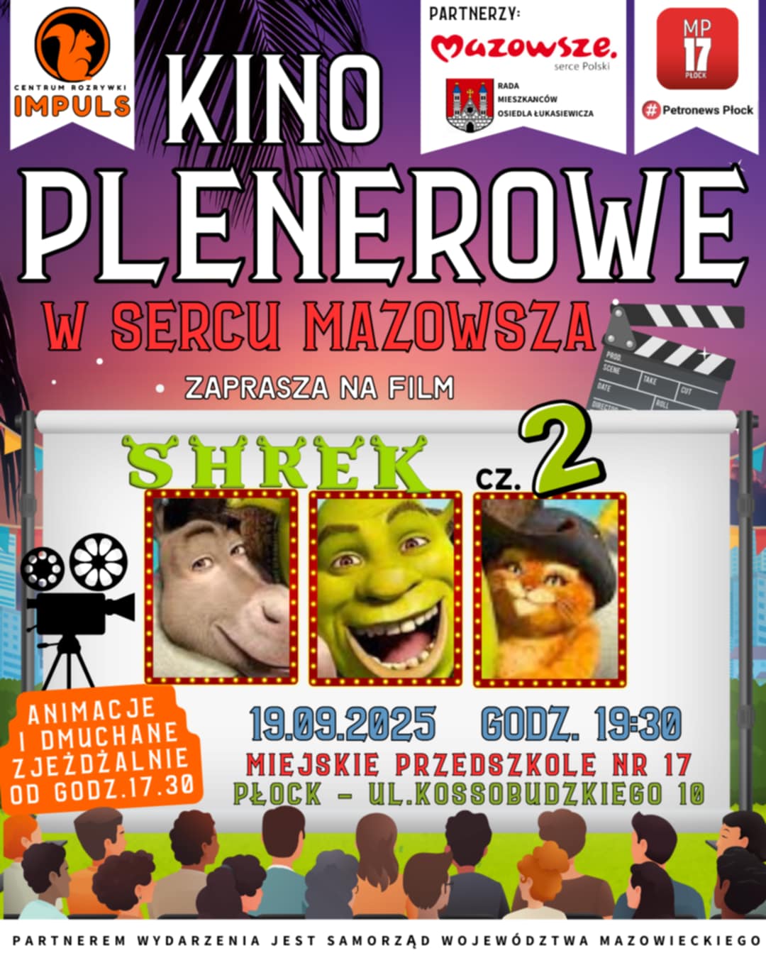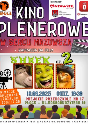 Start projekcji: godz. 19.30, teren Miejskiego Przedszkola nr 17 przy ul. Kossobudzkiego 10. To już trzecia – i ostatnia – odsłona plenerowego kina w ramach cyklu „Kino Plenerowe w Sercu Mazowsza”, który tego lata dostarczał mieszkańcom niezapomnianych emocji filmowych. Tym razem organizatorzy stawiają na klasykę animacji – kontynuację przygód Shreka, jego żony Fiony i przyjaciół w Królestwie Zasiedmiogórogrodzie.