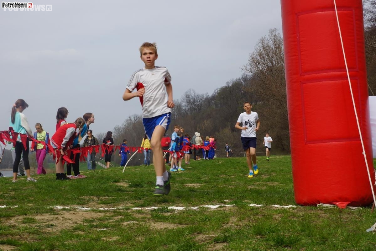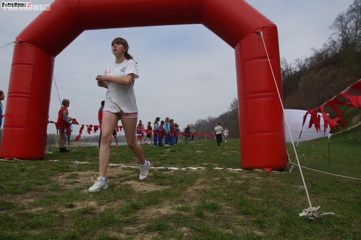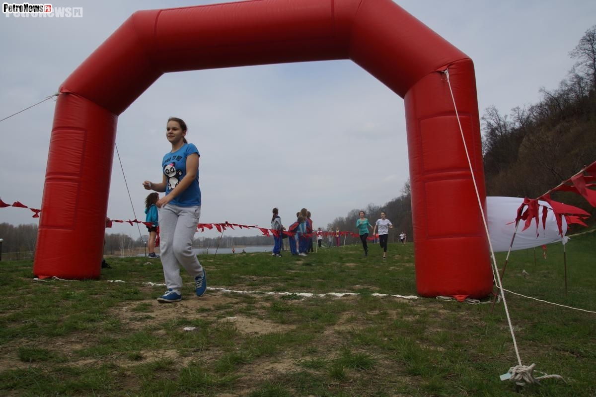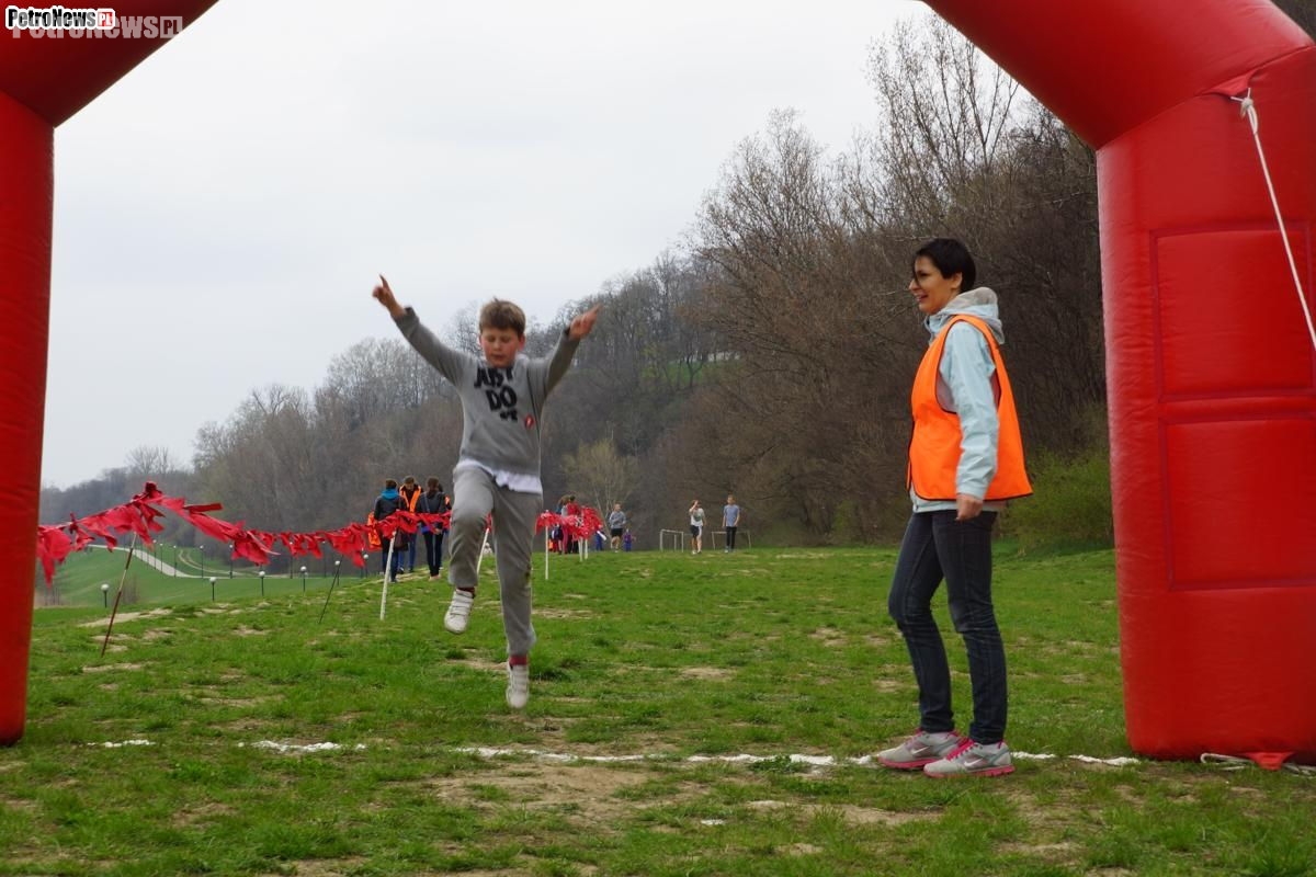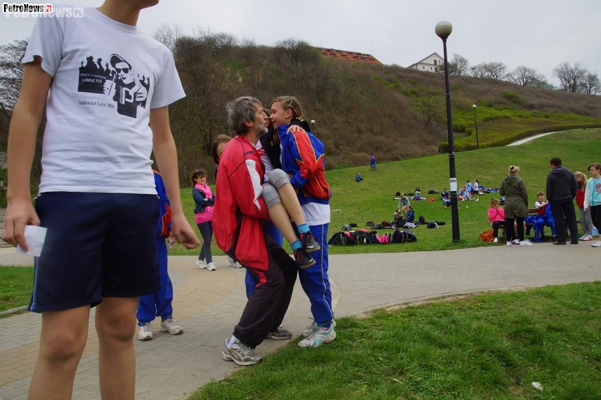 Już po drodze spotkaliśmy grupy uczniów, którzy małymi plamkami schodzili ze wszystkich stron skarpy, by w miejscu rejestracji stworzyć wielobarwne skupisko i znów rozprzestrzenić się, tym razem na zboczu skarpy, gdzie czekali na rozpoczęcie biegu. Dołączyliśmy do drużyny ze Szkoły Podstawowej nr 7. – O matko, takie duże kółko będziemy biec? – przeraził się jeden z młodszych uczestników. – Biegamy tu od początku istnienia konkursu – tłumaczyła opiekunka grupy. – Czwartoklasiści są pierwszy raz, ale już piąta i szósta klasa brała udział w poprzednich edycjach. To klasa sportowa, charty na bieganie – śmiała się.