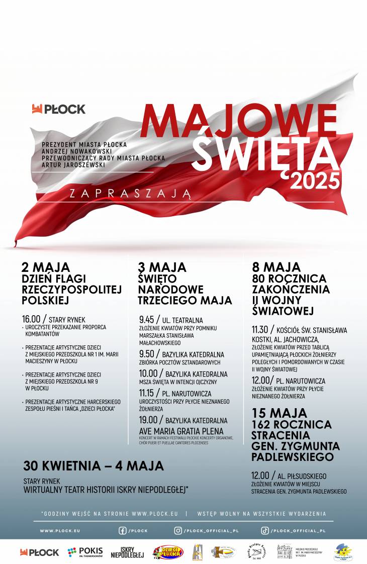 Uroczystości rozpoczną się o godz. 16.00 na Starym Rynku. Nastąpi powrót do tradycji przekazywania proporca ufundowanego przez środowisko kombatantów w 50. rocznicę wybuchu II wojny światowej z przesłaniem pielęgnowania tradycji oraz szacunku do flagi narodowej i pokoju. Wystąpią również Dzieci Płocka.