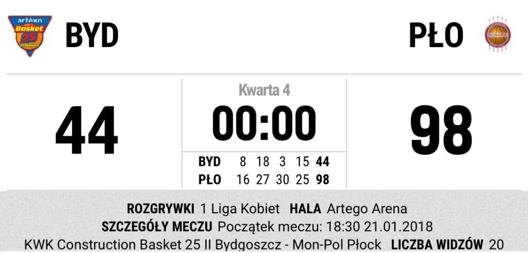KWK Construction Basket 25 II Bydgoszcz – MON-POL Płock 44:98 (8:16, 18:27, 3:30, 15:25)
