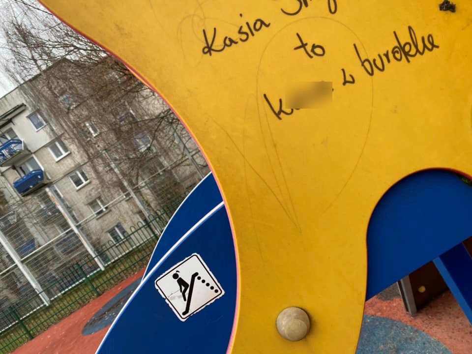 Post dotyczy dewastacji, poprzez zamieszczenie wulgarnych napisów na urządzeniach znajdujących się na placu zabaw. Autor lub autorka napisu podała imię i (prawdopodobnie) nazwisko dwóch dziewczyn, określając je nieprzyzwoitymi słowami.