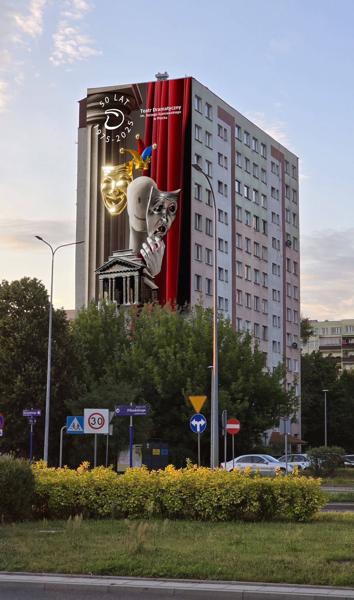 – To będzie prawdziwie teatralne malowidło! Rozpoczęliśmy prace przy muralu na szczycie bloku przy ul. Gierzyńskiego 19. Dzieło upamiętni 50 lat działalności kulturalnej Teatru Płockiego im. Jerzego Szaniawskiego. Projekt powstaje dzięki dobrej współpracy z teatrem i Mazowiecką Spółdzielnią Mieszkaniową, a autorem jest miejski grafik Robert Parzychowski – napisał prezydent w mediach społecznościowych.