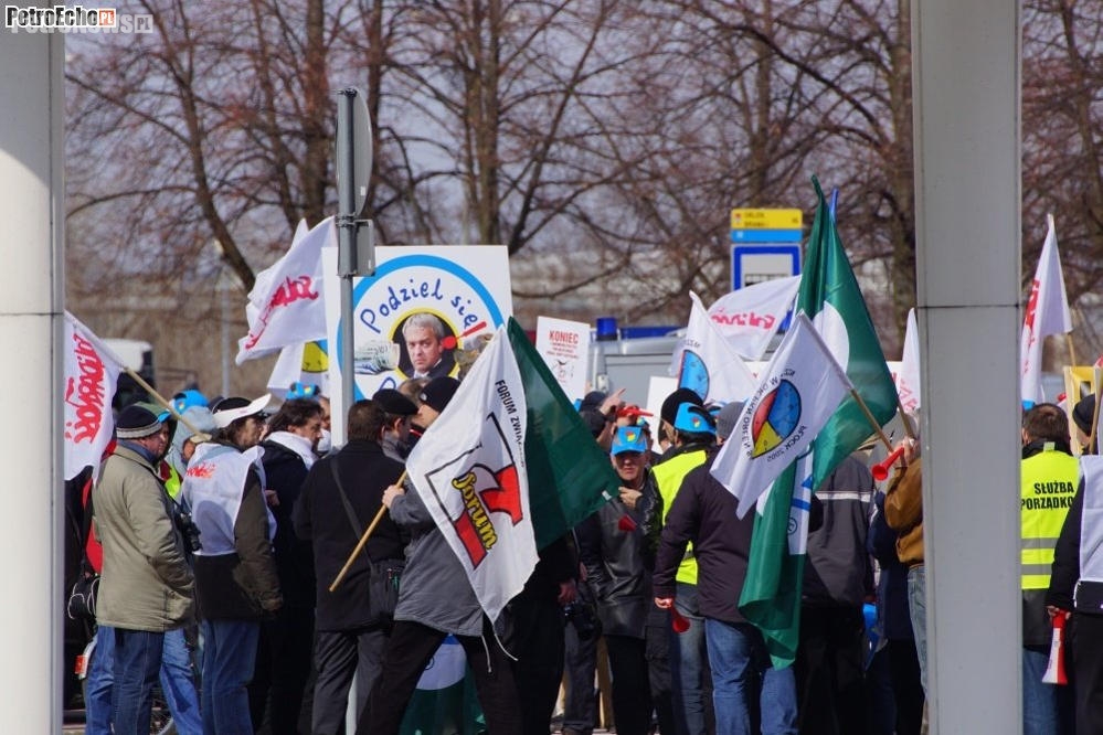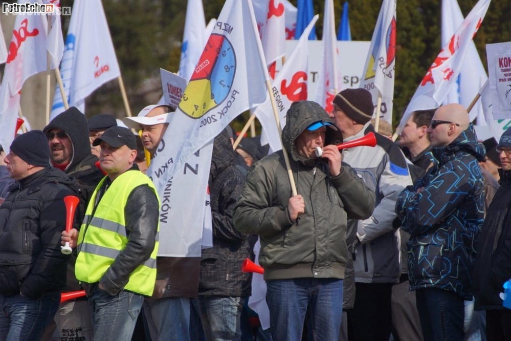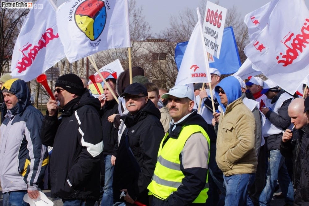 Ręce precz od pięciobrygadówki!, Jacek Krawiec oddaj radiowęzeł!, Koniec z rabunkową polityką PKN Orlen wobec spółek Grupy Kapitałowej!, STOP dla umów śmieciowych!, NIE dla sprzedaży Orlen Medica! – takie hasła nieśli przed sobą protestujący przed siedzibą Orlenu pracownicy. Od godz. 14 trwała tam dzisiaj pikieta protestacyjna, m.in. przeciwko decyzji zarządu o zastąpieniu podwyżek premiami. W proteście uczestniczyło kilkaset osób.