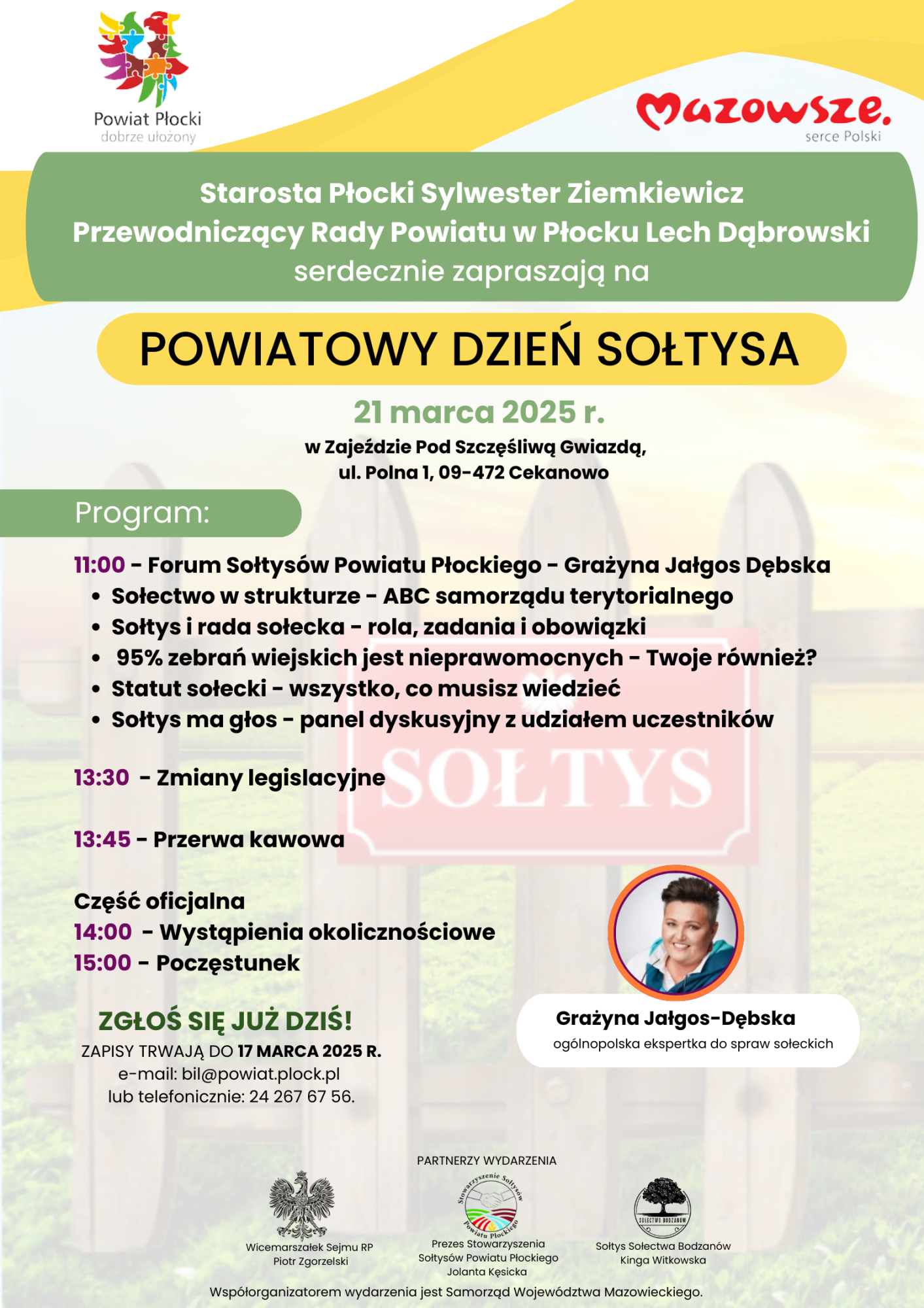 Sylwester Ziemkiewicz Starosta Płocki oraz Przewodniczący Rady Powiatu w Płocku Lech Dąbrowski serdecznie zapraszają Sołtysów z powiatu płockiego na Powiatowy Dzień Sołtysa.