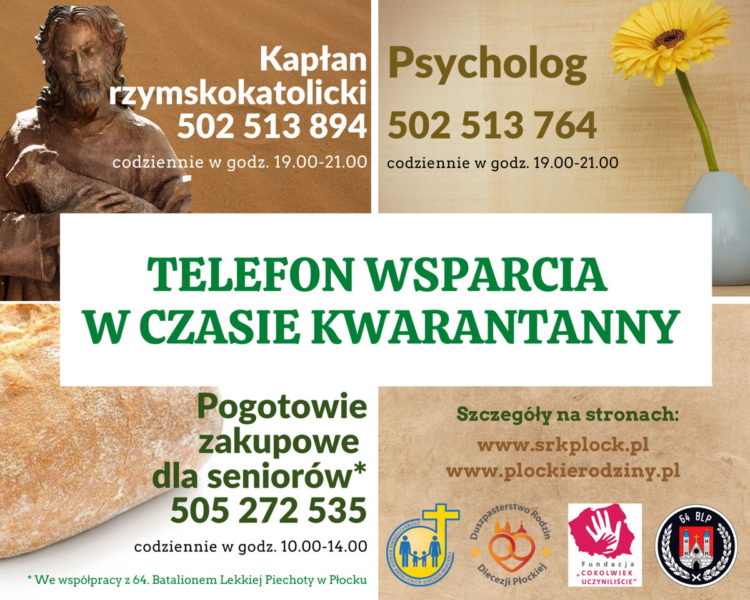 Stowarzyszenie Rodzin Katolickich Diecezji Płockiej uruchomiło telefon wsparcia w czasie kwarantanny. Zaprasza do korzystania z telefonu do duchowego i psychologa. Osoby potrzebujące pomocy psychologicznej mogą dzwonić codziennie w godz. 19-21, tel. 502-513-764. Z kolei osoby, które chciałyby porozmawiać z księdzem, mogą to uczynić w tych samych godzinach, pod numerem telefonu 502-513-894.