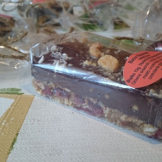 Baton Bakaliowy, 5 sztuk, Główne składniki: nerkowce, masło orzechowe, sezam, daktyle suszone, żurawina suszona, mleko kokosowe, czekolada min 90% kakao (własnej produkcji bez cukru), ksylitol, kakao naturalne – 38 zł.