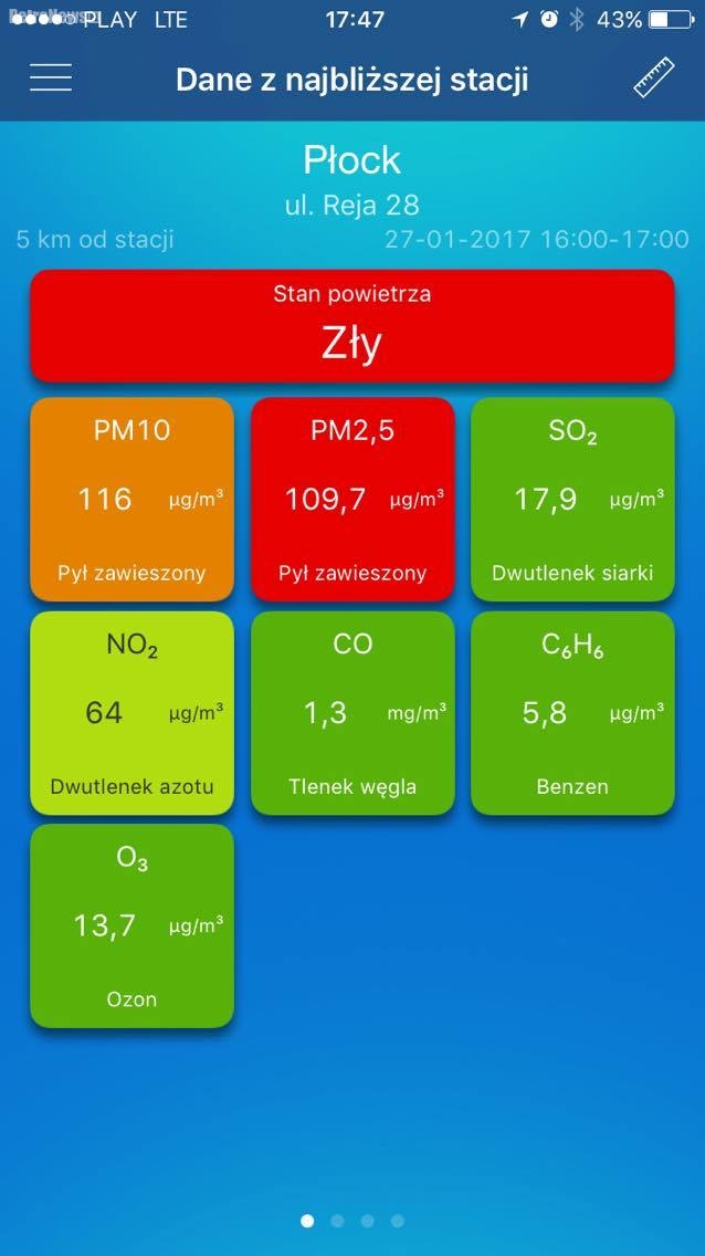 Również w Płocku stacja pomiarowa przy ul. Reja podaje wskazanie powietrza jako „złe” z tendencją rosnącą. Stan na godz. 17 wskazywał poziom PM10 – 116 µg/m3, natomiast PM2,5 – 109,7 µg/m3. Godzinę później wskazania były już wyższe: PM10 – 121 µg/m3, natomiast PM2,5 – 114,6 µg/m3.