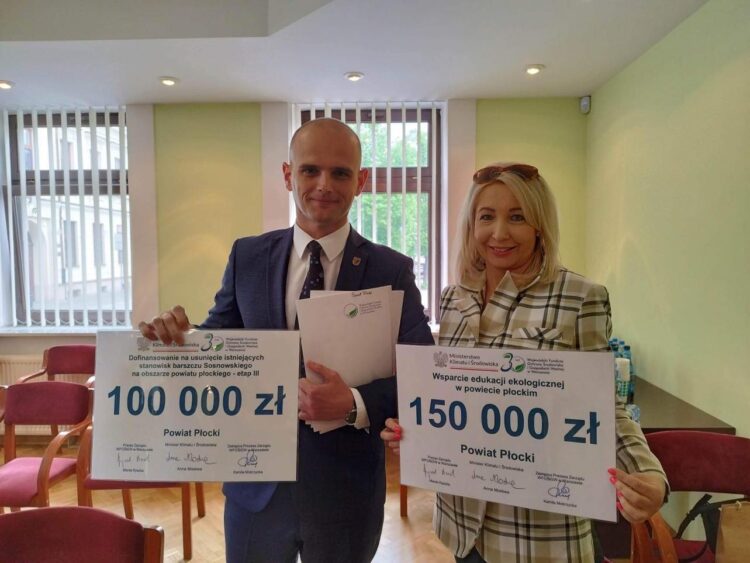 W poniedziałek, 15 maja 2023 roku, Starosta Płocki Sylwester Ziemkiewicz i Wicestarosta Iwona Sierocka odebrali w siedzibie Wojewódzkiego Funduszu Ochrony Środowiska i Gospodarki Wodnej w Warszawie filia w Płocku dofinansowanie na działania ekologiczne. Pierwsze to dofinansowanie na „Usunięcie istniejących stanowisk barszczu Sosnowskiego na obszarze powiatu płockiego – etap III”, drugie – „Wsparcie edukacji ekologicznej w powiecie płockim”.
