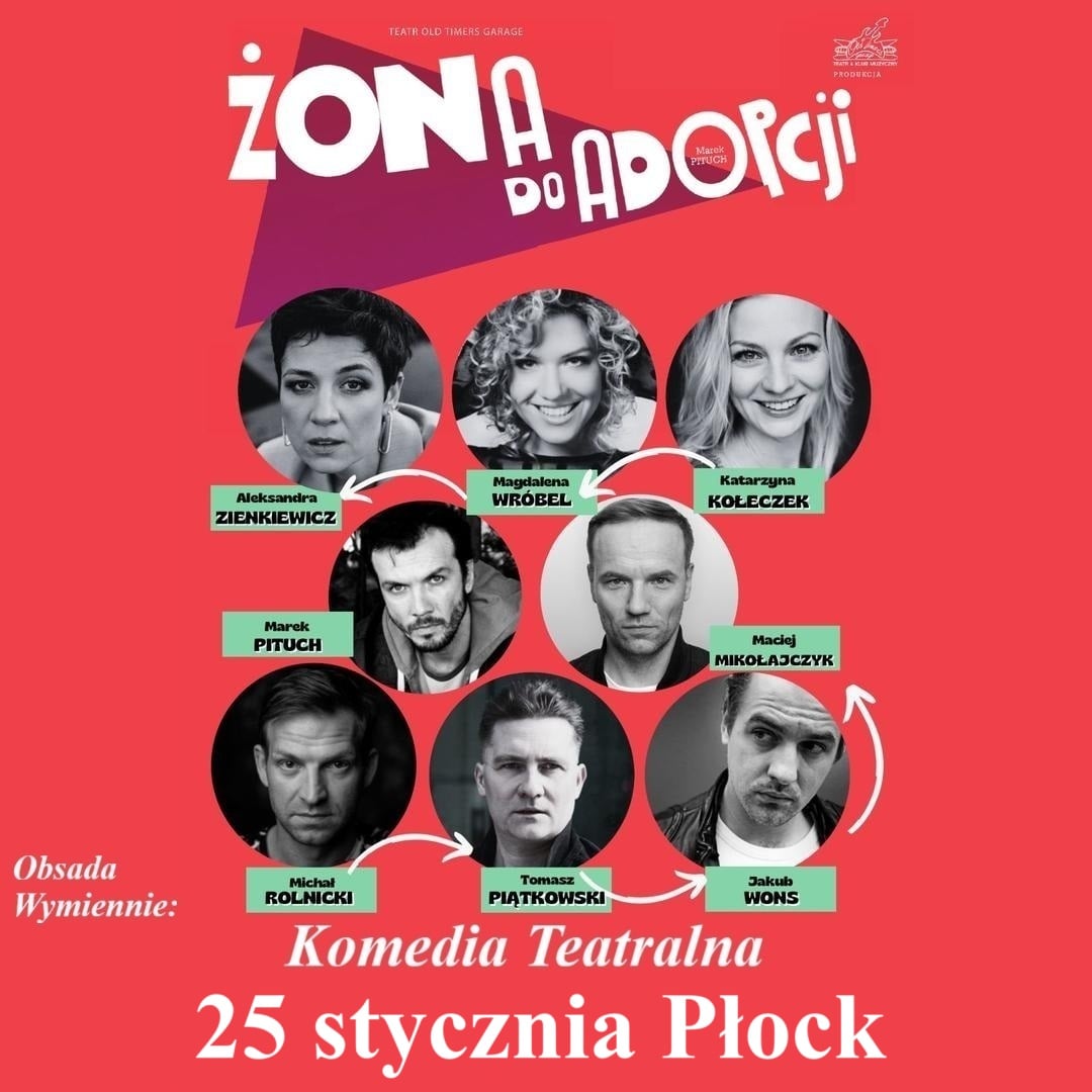 Już 25 stycznia w Płocku czeka nas solidna dawka śmiechu i absurdalnych zwrotów akcji. Na scenie zobaczymy lubianych przez widzów aktorów znanych z popularnych seriali telewizyjnych: Aleksandrę Zienkiewicz, Martę Wróbel, Michała Rolnickiego, Macieja Mikołajczyka, Tomasza Piątkowskiego (występujących zamiennie) oraz niezastąpionego Marka Pitucha. Wszyscy oni pojawią się w kultowej komedii „Żona do adopcji”, która od lat podbija serca publiczności w całej Polsce.